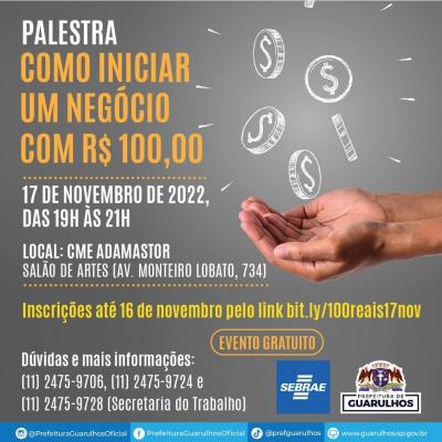 Para aqueles que desejam iniciar um empreendimento próprio, a Prefeitura de Guarulhos, em parceria com o Serviço Brasileiro de Apoio às Micro e Pequenas Empresas (Sebrae), realizará nesta quinta-feira (17), das 19h às 21h, a palestra “Como iniciar um negócio com R$ 100”. O evento, que é gratuito e acontecerá presencialmente no Salão de Artes do Adamastor, receberá inscrições até esta quarta-feira (16) pelo link bit.ly/100reais17nov.