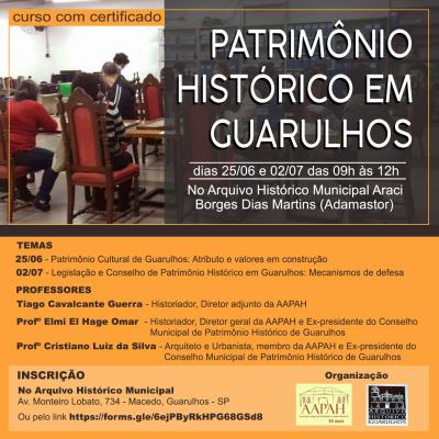 Patrimônio Histórico em Guarulhos é o tema do curso gratuito oferecido pela Associação Amigos do Patrimônio e Arquivo Histórico (AAPAH) que acontece nos dias 25 de junho e 2 de julho, sábados, das 9h às 12h, no Arquivo Histórico Municipal de Guarulhos Araci Borges Dias Martins.