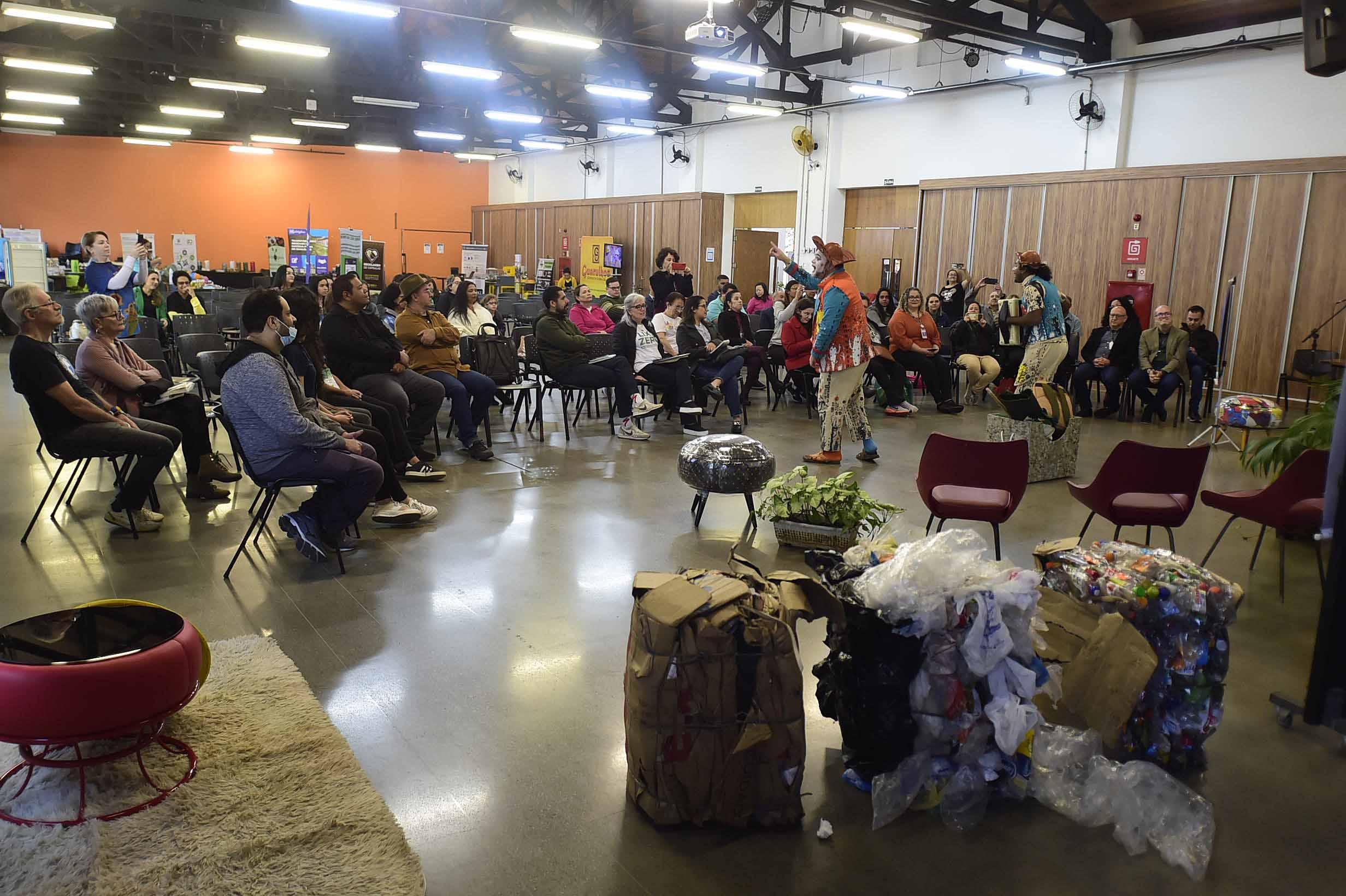 O espetáculo teatral “Fim que vira começo que vira fim”, produzido pela RN Produções Artísticas, em parceria com a OnG Espaço Urbano e patrocinado pela empresa Tetra Pak, deu início à programação do segundo e último dia do Encontro Lixo Zero Guarulhos - Melhores Práticas, nesta terça-feira (6), no Centro de Educação Municipal Adamastor, no Macedo. De forma lúdica, a dupla em cena apresentou ao público a importância do compromisso de cada pessoa com a reciclagem e a destinação correta de materiais utilizados diariamente, como embalagens longa vida, plástico, metal, vidro, papel, entre outros.