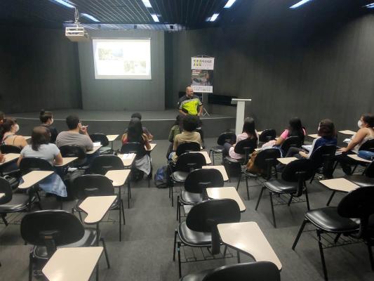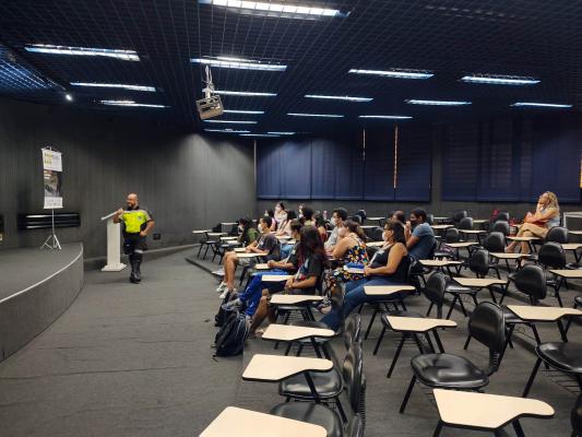 O educador da Secretaria de Transportes e Mobilidade Urbana (STMU) de Guarulhos, Roberto Pereira Pardinho, e os agentes de trânsito Erick Basselli e Eduardo Navarrete palestraram aos estudantes sobre o uso abusivo do álcool e as suas consequências no trânsito, no trabalho, na vida pessoal e social.