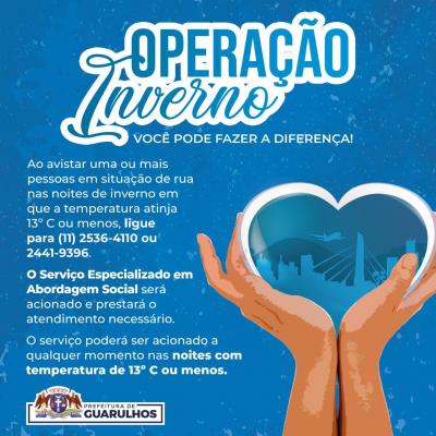 Uma nova frente fria deve derrubar as temperaturas ainda mais a partir desta terça-feira (20), com previsão de sensação térmica de 1º C pela manhã. A Prefeitura de Guarulhos alerta a população para que acione a Operação Inverno, por meio do Serviço de Especializado de Abordagem Social (Seas), se encontrar alguma pessoa em situação de rua. As equipes do Seas atendem pelos telefones 2536-4110 e 2441-9396 e podem ser contatadas sempre que a temperatura estiver igual ou abaixo de 13ºC, de segunda a sexta-feira.