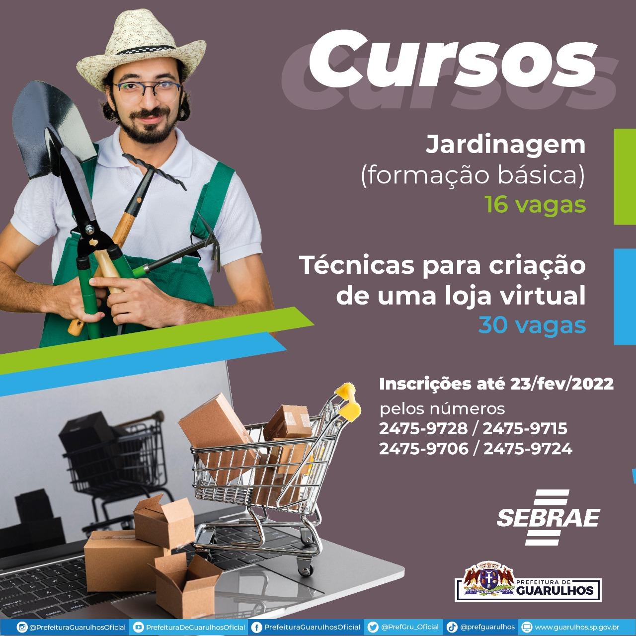 A Prefeitura de Guarulhos, em parceria com o Sebrae, receberá até 23 de fevereiro as inscrições gratuitas para os cursos de qualificação Técnicas para Criação de uma Loja Virtual (30 vagas) e Formação Básica de Jardinagem (16 vagas).