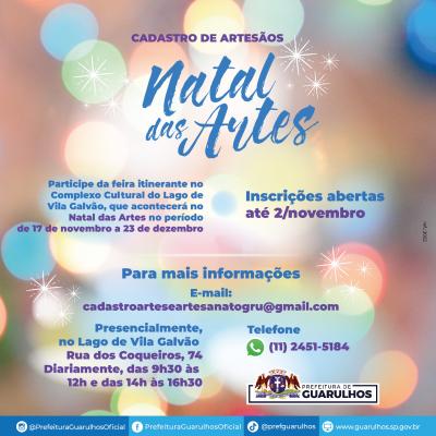 Até o dia 2 de novembro a Prefeitura está com inscrições abertas para artesãos de Guarulhos interessados em participar de feira itinerante no Complexo Cultural do Lago de Vila Galvão, durante as festividades do Natal das Artes. Iniciativa da Secretaria de Cultura, o evento está previsto para o período de 17 de novembro a 23 de dezembro, de quinta a domingo, das 14h às 19h.