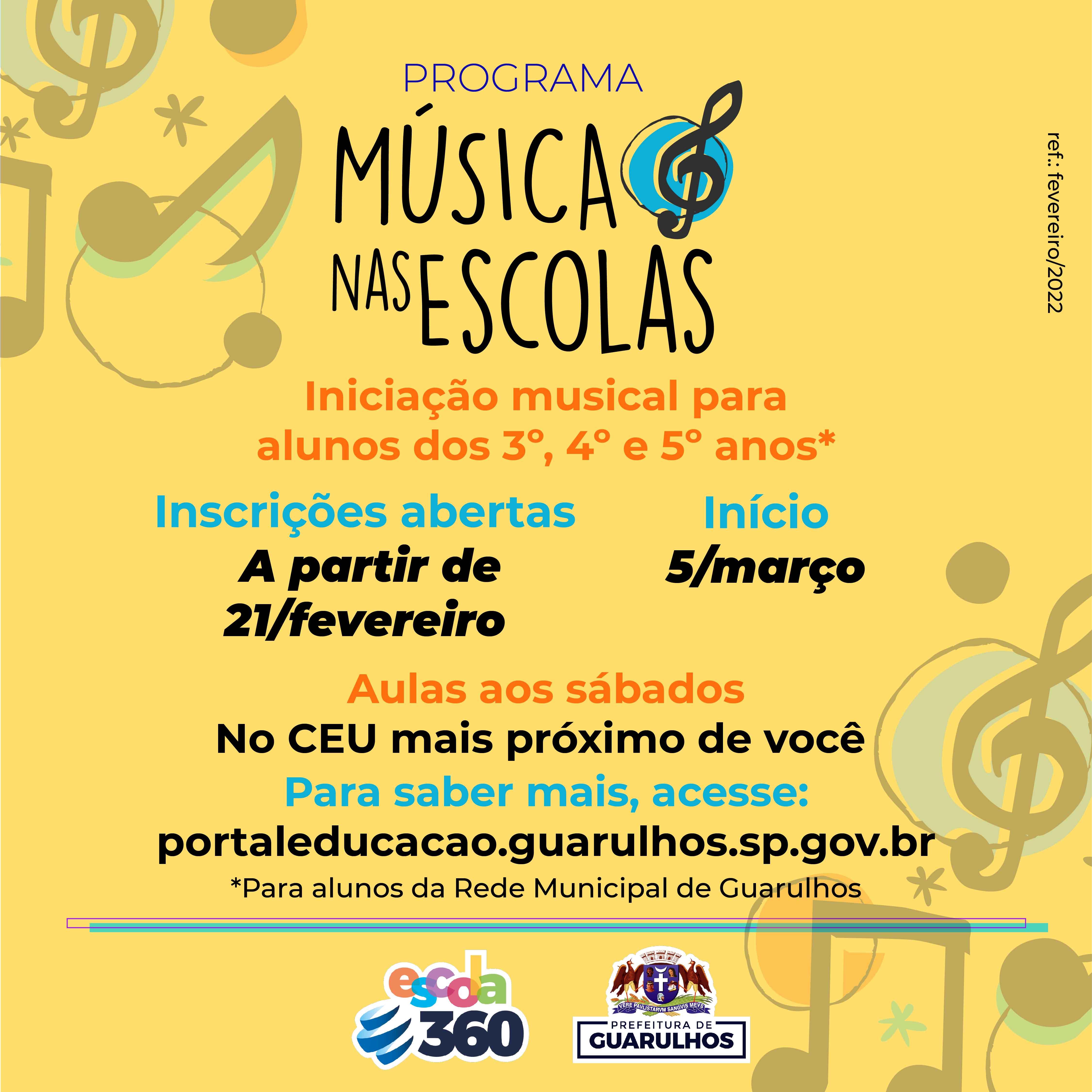 A partir da próxima segunda-feira (21) a Prefeitura de Guarulhos abre inscrições para o Programa Música nas Escolas, iniciativa das secretarias de Educação e Cultura para a oferta de aulas gratuitas de iniciação musical a alunos da rede municipal. Destinadas a estudantes do 3º, do 4º e do 5º ano, as aulas são oferecidas em todos os CEUs da cidade, sempre aos sábados. Elas terão início em 5 de março.