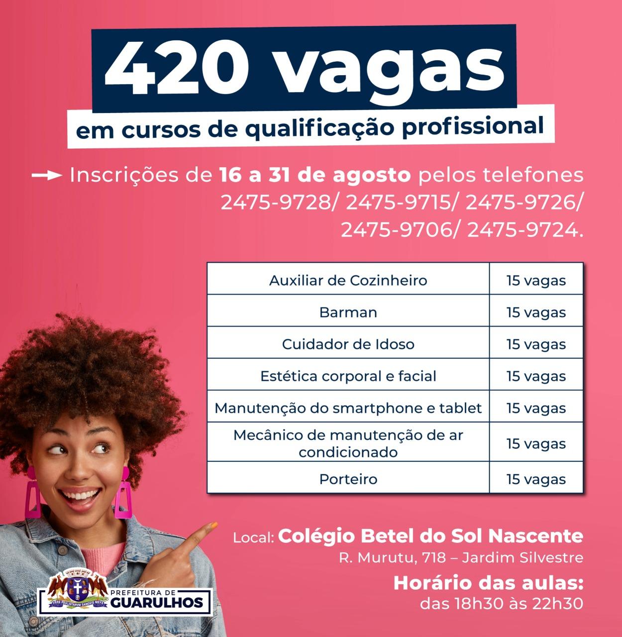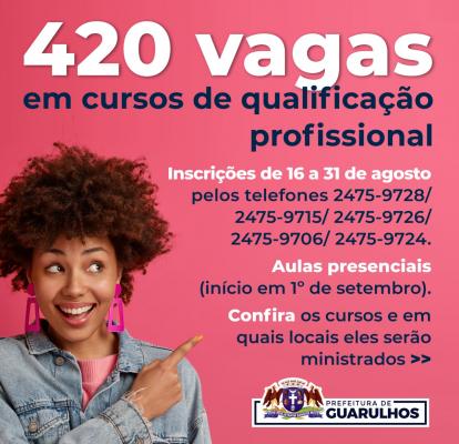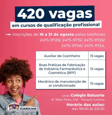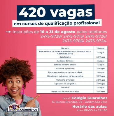 A Secretaria do Trabalho de Guarulhos receberá até 31 de agosto inscrições para 420 vagas dos cursos de qualificação profissional do Centro de Treinamento e Mão de Obra (CTMO). Os interessados devem se inscrever pelos telefones 2475-9728/ 2475-9715/ 2475-9726/ 2475-9706/ 2475-9724.