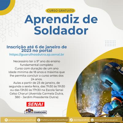 A Prefeitura de Guarulhos abriu, em parceria com o Serviço Nacional de Aprendizagem Industrial (Senai), as inscrições para o curso gratuito de aprendiz de soldador. As aulas acontecerão presencialmente na unidade Celso Charuri, localizada na avenida Carmela Dutra, 380, no Jardim Presidente Dutra. As inscrições devem ser feitas até o dia 6 de janeiro pelo portal https://guarulhosdutra.sp.senai.br.