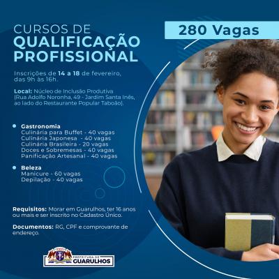 A Prefeitura de Guarulhos receberá entre os dias 14 e 18 de fevereiro inscrições para 280 vagas em cursos de capacitação profissional nas áreas de gastronomia e beleza. Os cursos disponíveis são culinária para buffet (40), culinária japonesa (40), culinária brasileira (20), doces e sobremesas (40), panificação artesanal (40), manicure (60) e depilação (40).