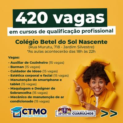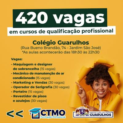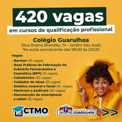 O Centro de Treinamento de Mão de Obra (CTMO), programa da Prefeitura de Guarulhos, abrirá na próxima semana as inscrições para 420 vagas em cursos de qualificação profissional. Em um primeiro momento as inscrições acontecerão nos dias 3 e 4 de maio presencialmente na 1ª Semana do Trabalhador, que acontecerá no Adamastor, e, após isso, pelos telefones 2475-9706 / 2475-9715 / 2475-9724 / 2475-9725 / 2475-9728, da Secretaria do Trabalho, até o dia 20 de maio.