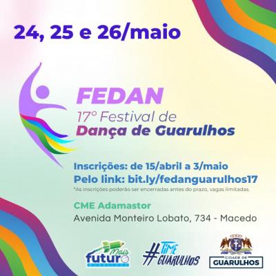 A Prefeitura está com inscrições abertas até o dia 3 de maio para o 17º Festival de Dança (Fedan) de Guarulhos. Com um total de 80 vagas disponíveis, o evento estimula a participação de escolas de dança da cidade, o entusiasmo e o engajamento da comunidade dançante. Grande espetáculo de movimento e arte, o Fedan acontecerá no Adamastor (avenida Monteiro Lobato, 734, Macedo) nos dias 24, 25 e 26 de maio.