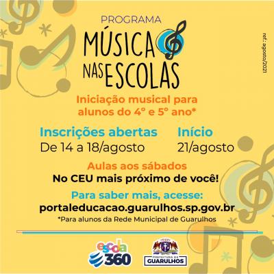 Entre os dias 14 e 18 de agosto estão abertas as inscrições para o programa Música nas Escolas, iniciativa das secretarias de Educação e Cultura para a oferta de aulas coletivas de música para alunos da rede municipal. Destinadas a alunos do 4º e do 5º ano, as aulas são gratuitas e oferecidas em todos os CEUs da cidade, sempre aos sábados.