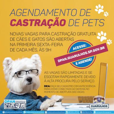 O Departamento de Proteção Animal (DPAN) de Guarulhos abre nesta sexta-feira (6), a partir das 9h, as inscrições online para 1.130 vagas referentes à campanha de outubro de castração gratuita de cães e gatos machos e fêmeas.