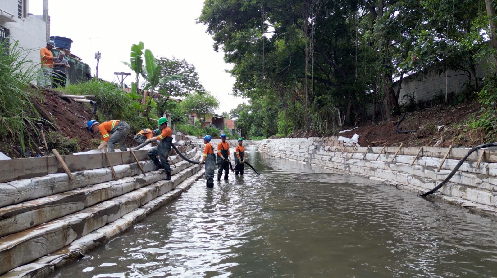 Localizado entre a avenida Papa João Paulo I e a rodovia Presidente Dutra, o córrego está sendo canalizado com a tecnologia Bolsacreto, sistema construtivo que utiliza bolsas de material geotêxtil de alta resistência preenchidas com concreto ou argamassa, permitindo a moldagem direta no local da obra, inclusive em áreas submersas ou de difícil acesso, eliminando a necessidade de ensecadeiras para drenagem do ambiente.