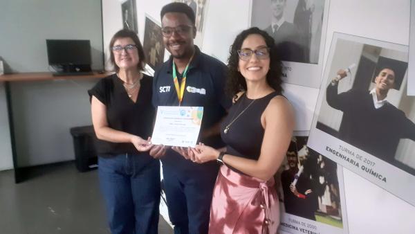 A Universidade Santo Amaro, representada pela coordenadora de extensão Ariana Aline da Silva e pela professora coordenadora dos cursos da área de tecnologia, Olinda Nogueira Paes Rizzo, recebeu nesta quinta-feira (26) a certificação pela participação da instituição de ensino no 5º Seminário de Robótica e Tecnologias Educacionais, realizado entre os dias 10 e 12 de março. O documento foi entregue pelo chefe de divisão técnica Thalles Guarani – responsável pelo Seminário desde sua primeira edição – em nome do Departamento de Ciência, Inovação, Ampliação Digital e Cidade Inteligente.