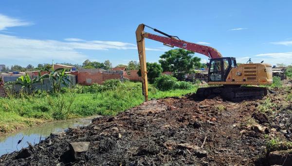 Os trabalhos, que têm conclusão prevista para daqui três dias, estão em ritmo acelerado e contam com o auxílio de uma escavadeira hidráulica para a retirada de sedimentos e a desobstrução do fluxo das águas.