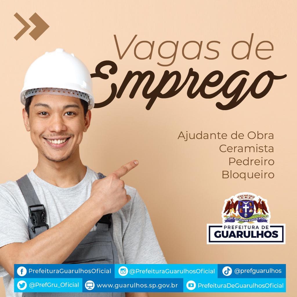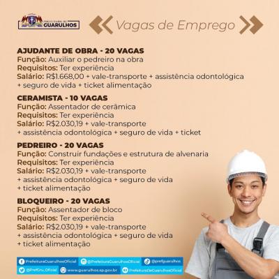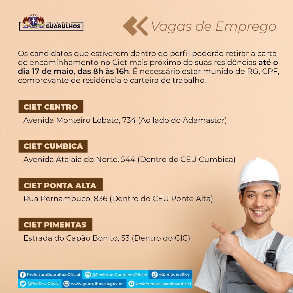 O Centro Integrado de Emprego, Trabalho e Renda (Ciet), órgão da Prefeitura de Guarulhos, receberá até terça-feira (17), das 8h às 16h, os interessados em preencher 70 vagas de emprego em quatro funções na área da construção. O candidato deve procurar uma das unidades do Ciet munido de RG, CPF, comprovante de residência e carteira de trabalho.