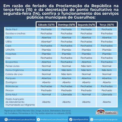 A Prefeitura de Guarulhos informa que em razão do ponto facultativo da próxima segunda-feira (14) e do feriado de terça-feira (15 - Dia da Proclamação da República), os serviços públicos municipais voltarão ao atendimento normal na quarta-feira (16) e funcionarão nesse período de recesso apenas os serviços essenciais. Veja o que abre e fecha e o que estará em plantão na tabela ao lado. Para expandir ou fazer download da tabela, clique com o cursor na imagem abaixo.
