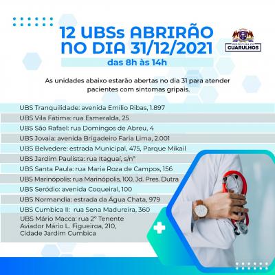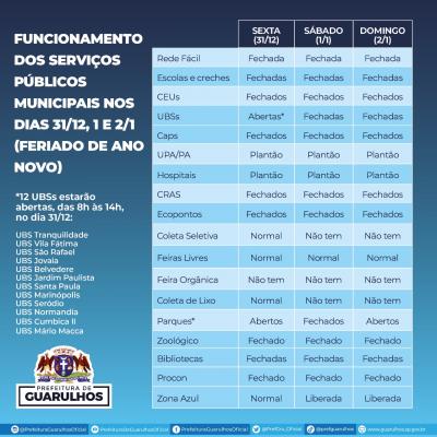 Em razão do feriado de Ano Novo neste sábado (1º) e do ponto facultativo de véspera na sexta-feira (31), confira, em imagem anexa, o funcionamento dos serviços públicos municipais nesse período.