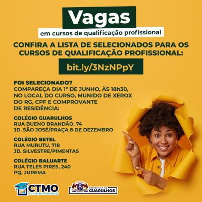A Prefeitura de Guarulhos divulgou nesta quarta-feira (25) a lista com os nomes dos selecionados para os cursos do Centro de Treinamento de Mão de Obra (CTMO), da Secretaria do Trabalho. A lista pode ser conferida no link https://bit.ly/3NzNPpY.