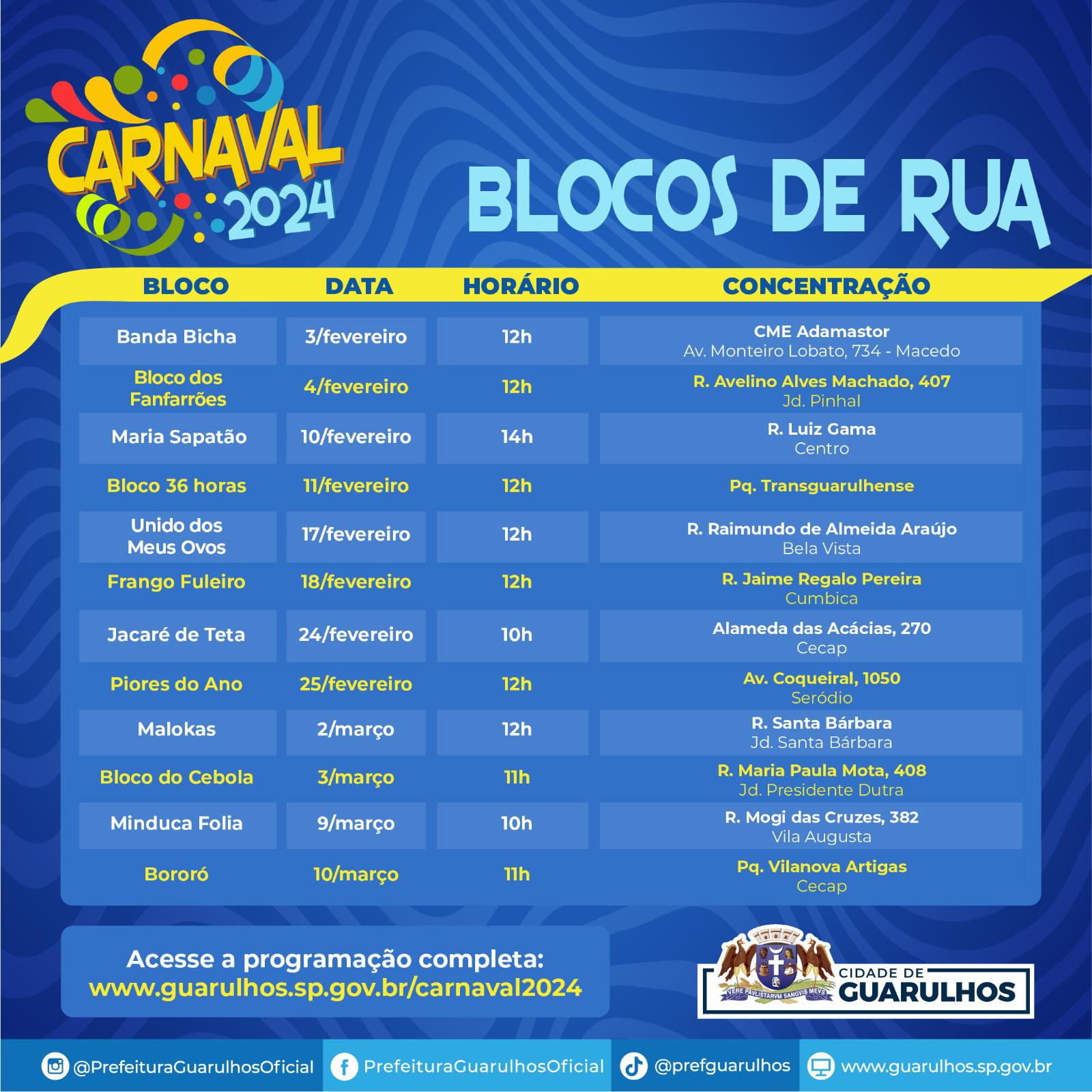 A programação do carnaval de rua em Guarulhos está recheada de blocos que levarão alegria e muita música para o folião guarulhense. Neste ano a cidade conta com 12 blocos, que tomam conta das ruas entre os dias 3 de fevereiro e 10 de março.