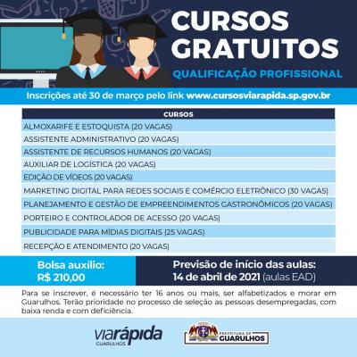 A Prefeitura de Guarulhos, em parceria com o governo do Estado de São Paulo, disponibilizará 215 vagas em cursos de qualificação profissional em diversas áreas de atuação, com bolsa-auxílio de R$ 210. As inscrições podem ser feitas até o dia 30 de março pelo link www.cursosviarapida.sp.gov.br.