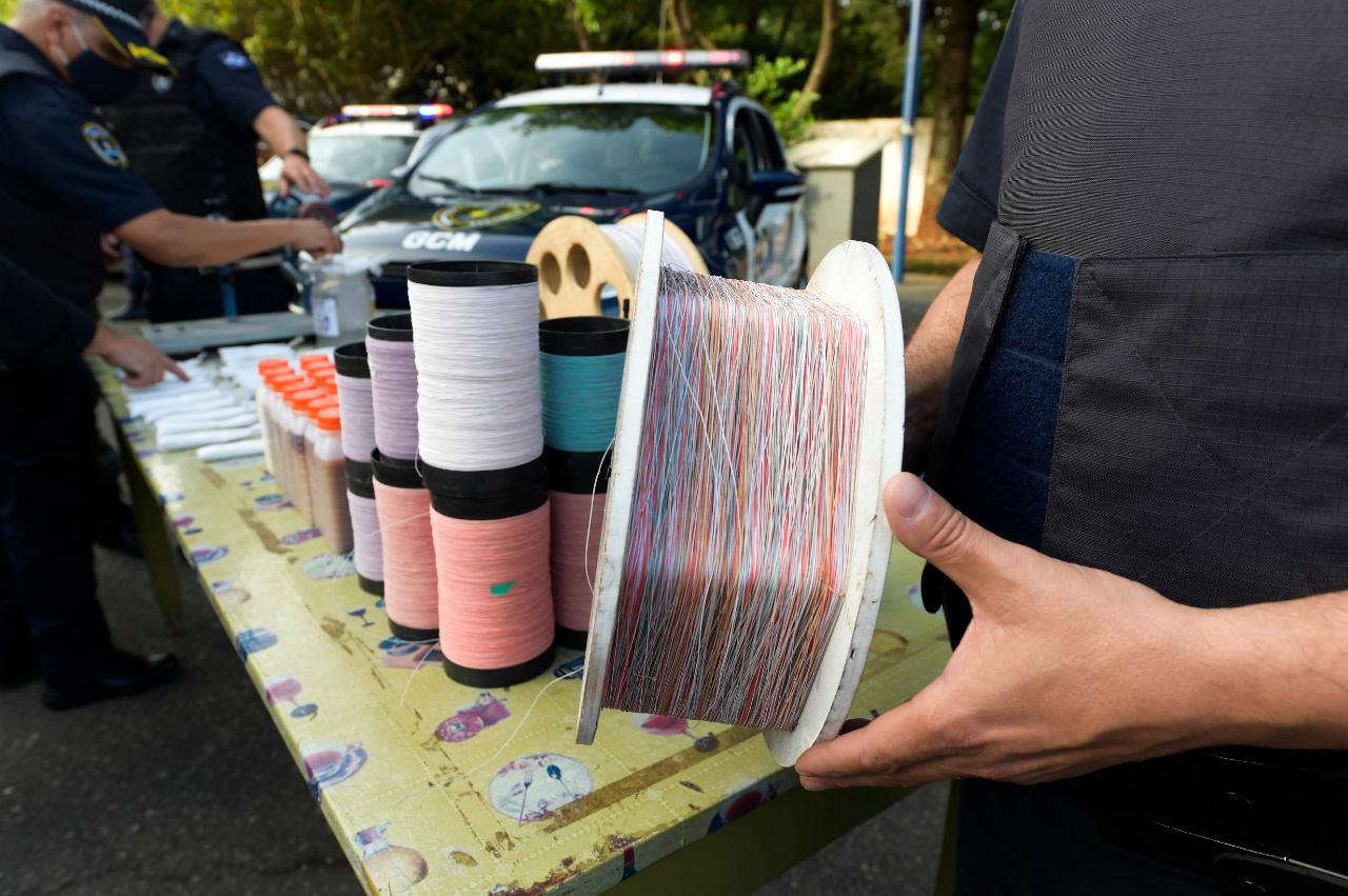 Ao todo, 56 saquinhos de vidro moído, 36 garrafas de cola, 15 latas de linha, 15 carretéis e uma máquina de enrolar linhas foram apreendidos nos bairros Jardim Adriana e Jardim Jovaia.