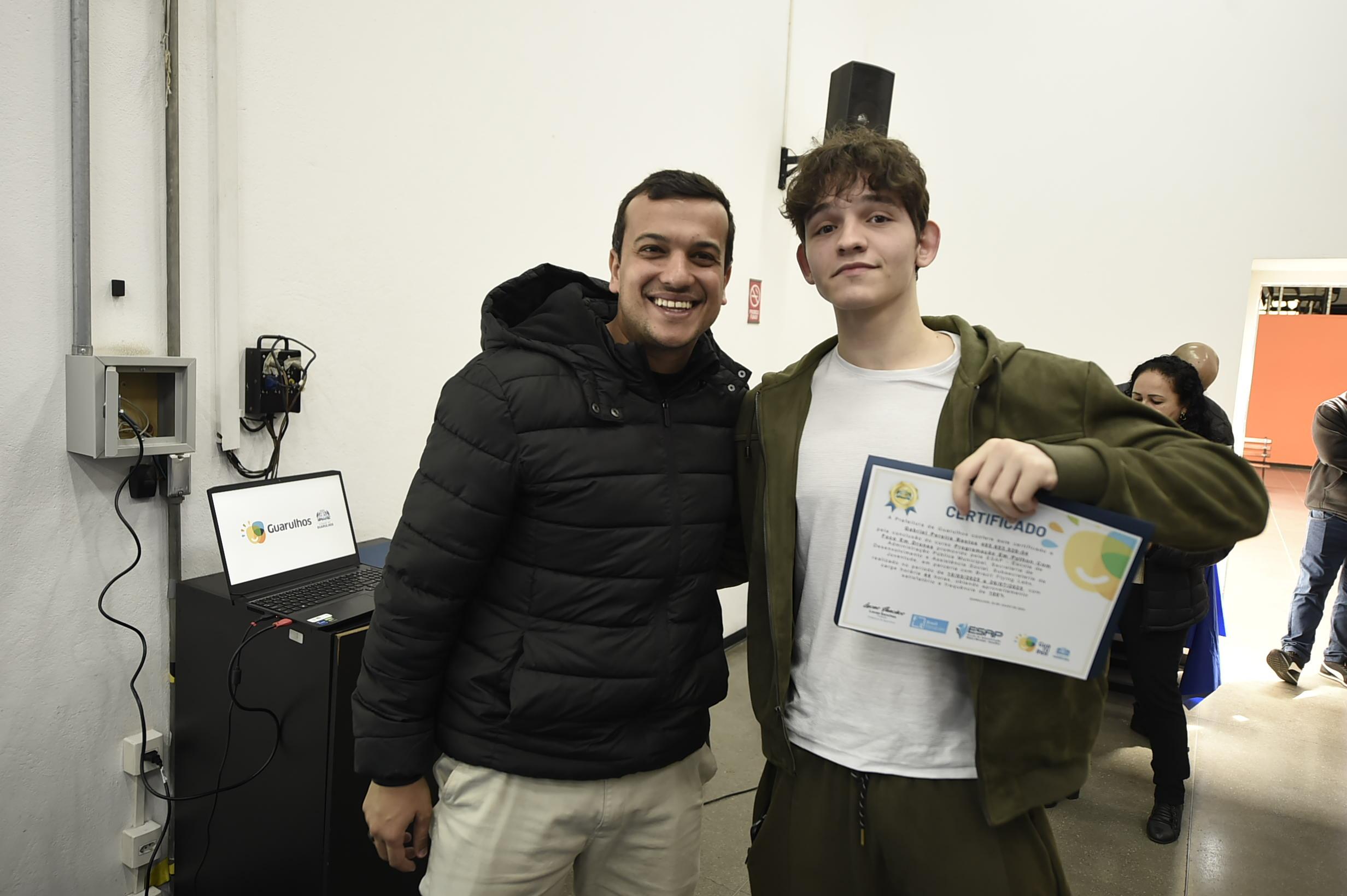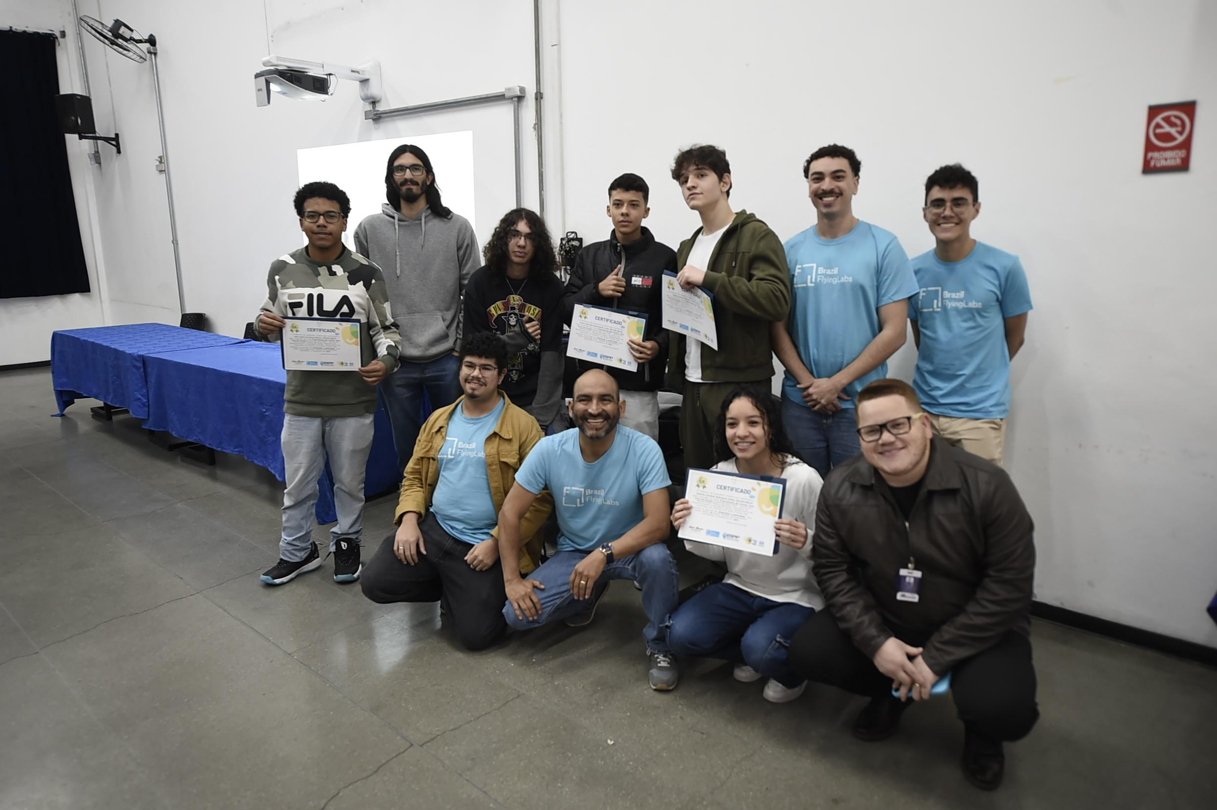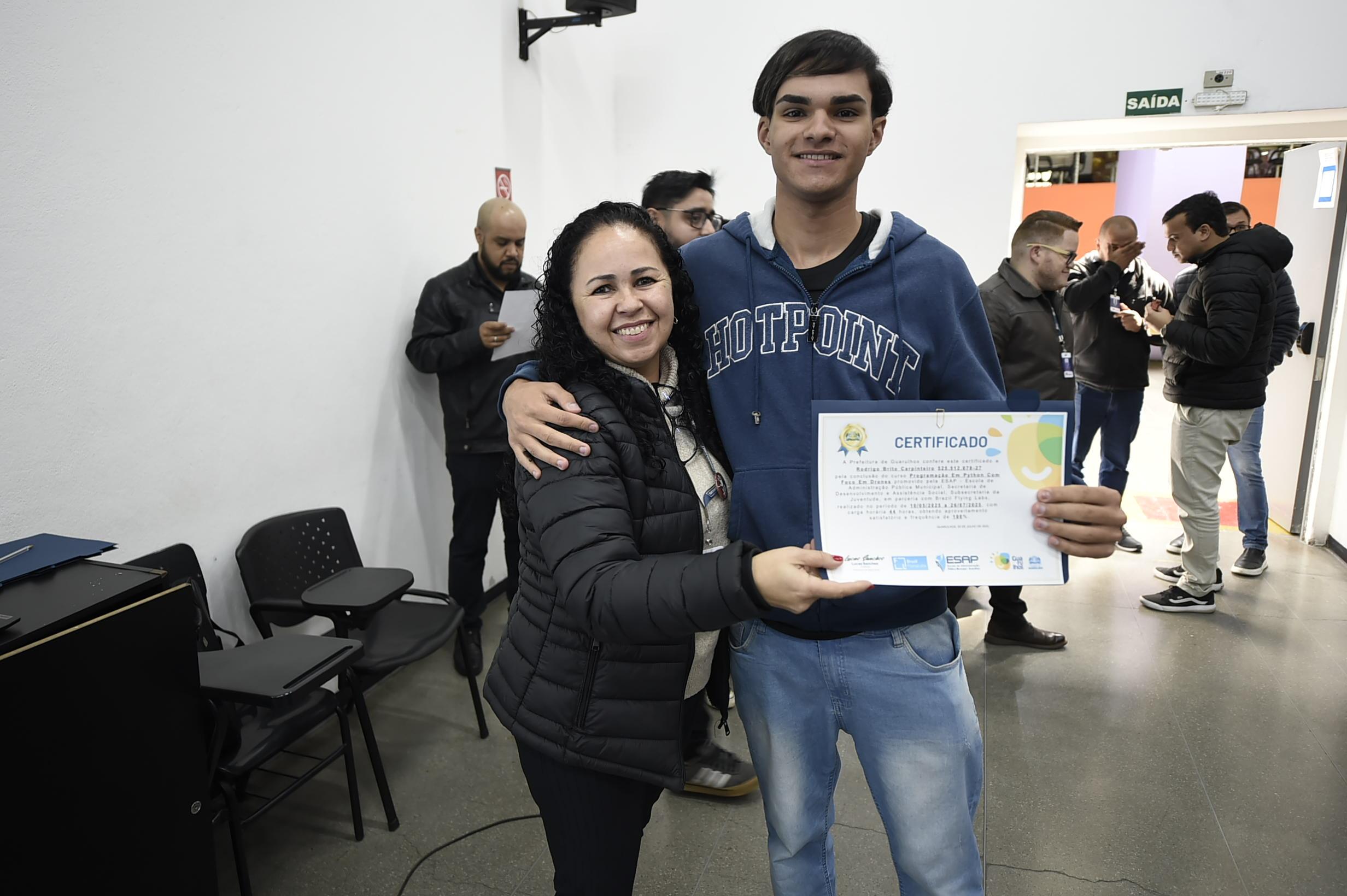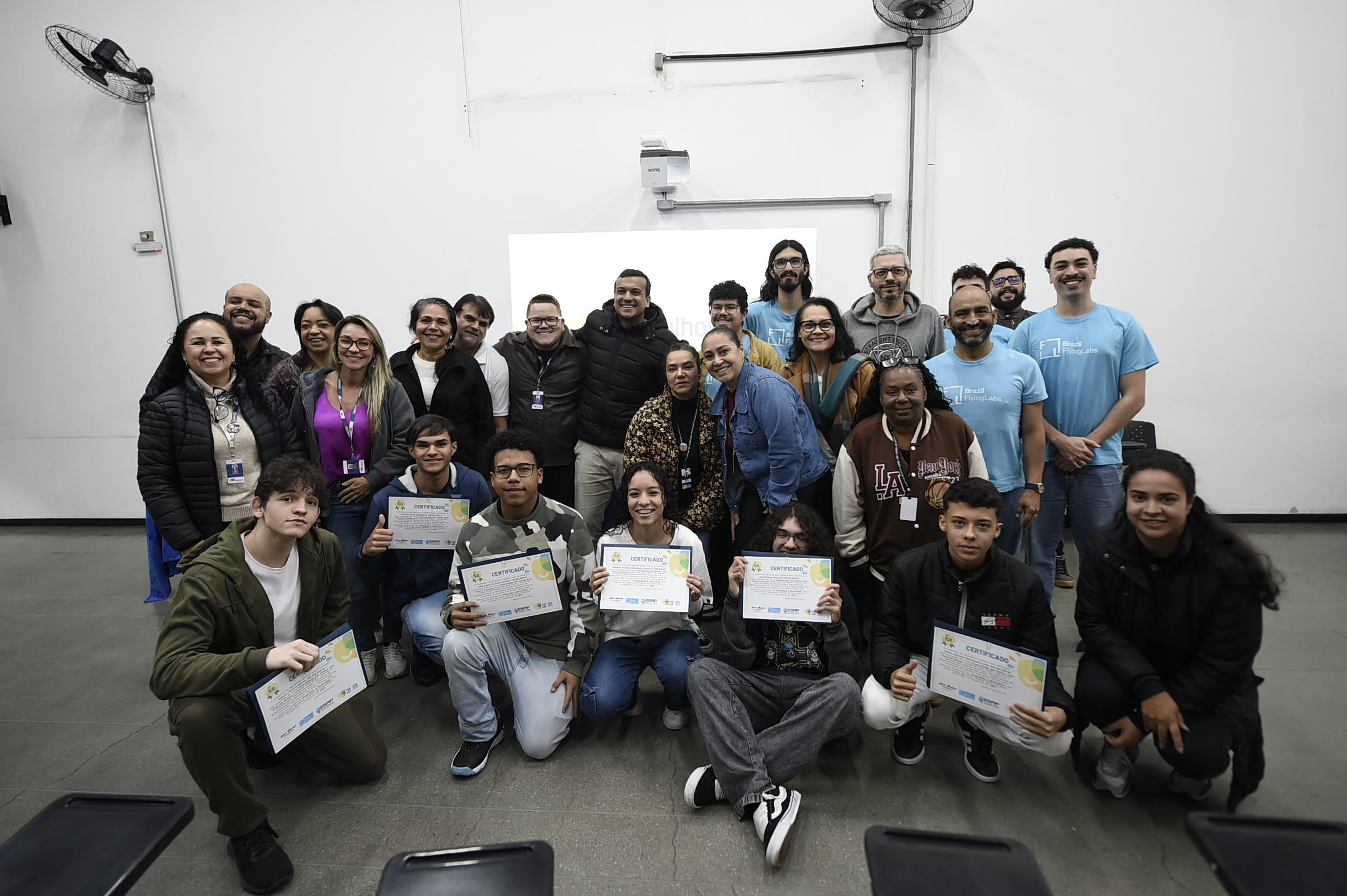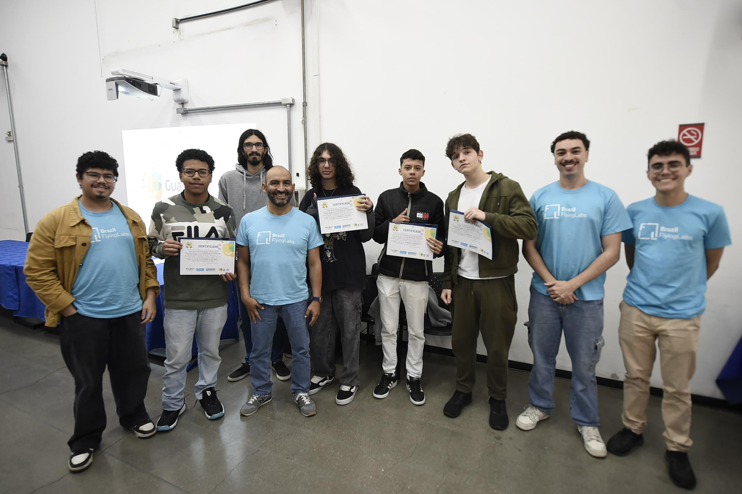 No sábado (26), a Prefeitura de Guarulhos entregou os certificados de conclusão da primeira edição do curso gratuito de Programação em Python e Pilotagem de Drones a nove alunos do Ensino Médio de escolas públicas do município, no Adamastor. A formação foi promovida pelas secretarias de Desenvolvimento e Assistência Social e de Gestão, e pela Subsecretaria da Juventude, em parceria com a Brazil Flying Labs, organização sem fins lucrativos estabelecida e coordenada pelos docentes da Universidade Federal do ABC (UFABC).