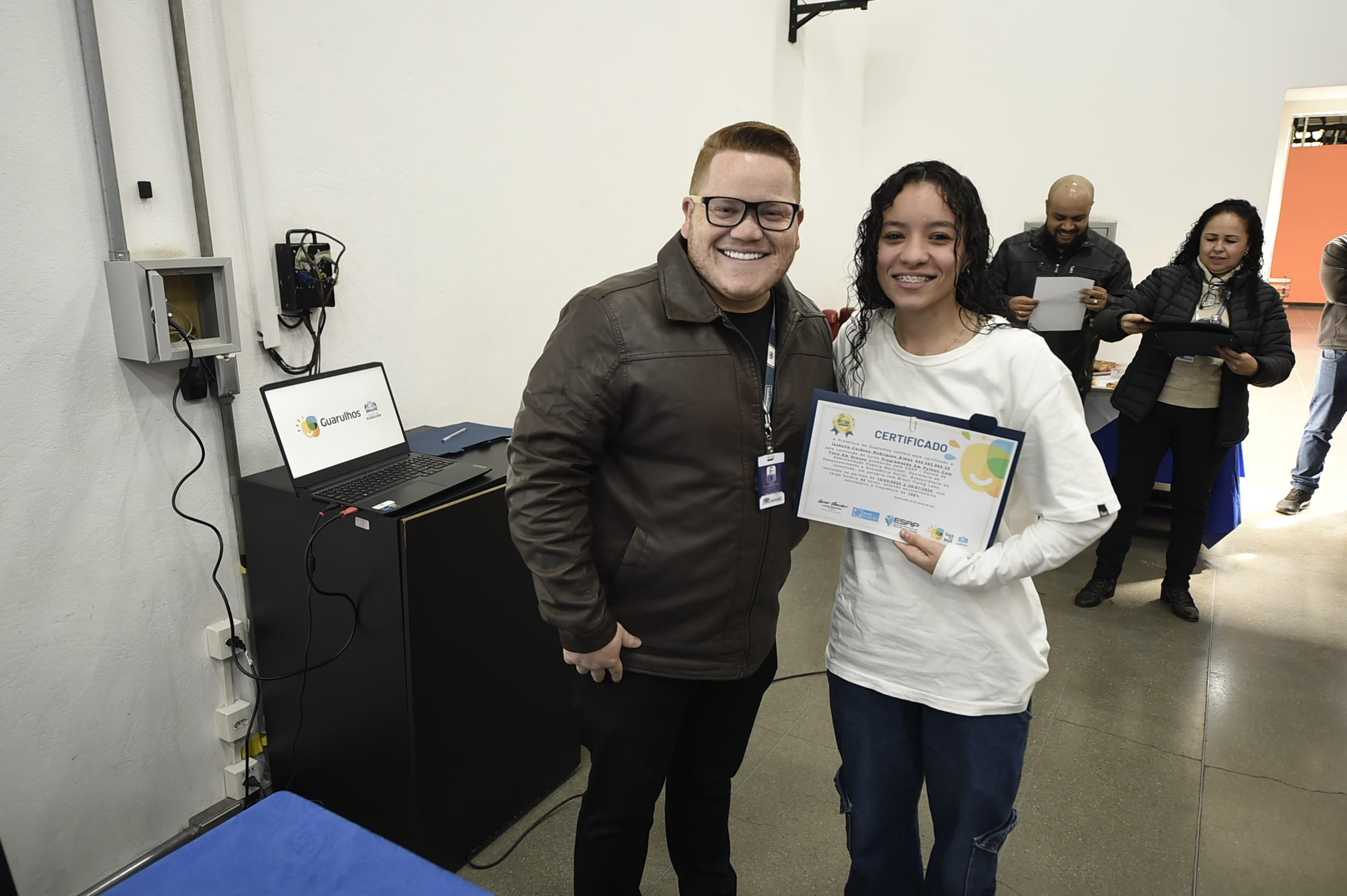 A cerimônia de entrega contou com as participações do subsecretário da Juventude, Joas Rodrigues de Melo, e do secretário de Desenvolvimento e Assistência Social, Henrique Rocha Menezes, além de pais de alunos, tutores e a equipe de apoio da Escola de Administração Pública Municipal de Guarulhos.