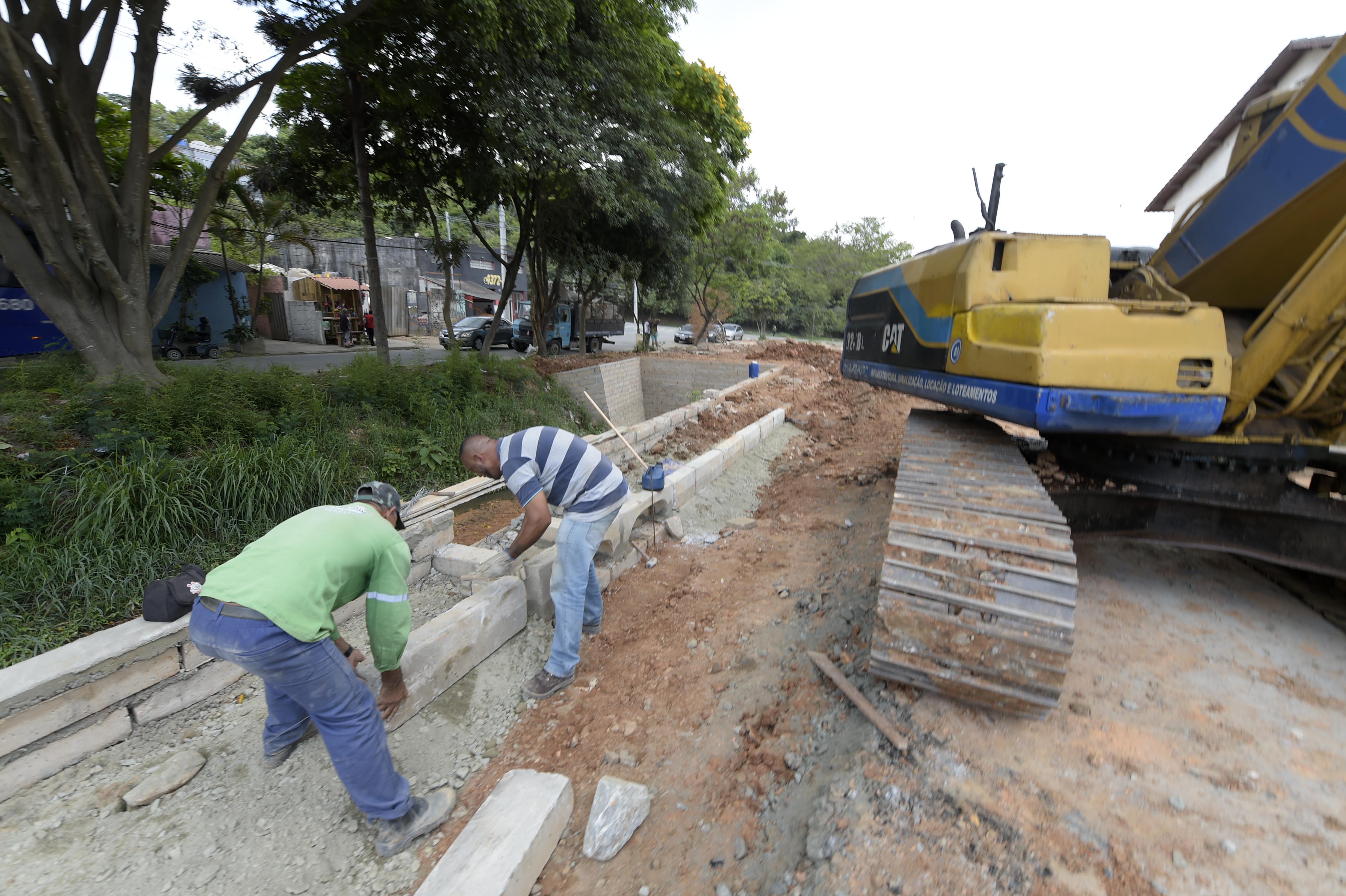 O Departamento de Obras, Administração Direta e Manutenção (DOADM) da Prefeitura de Guarulhos realiza a contenção das margens do córrego que passa pela rua Marilene Lima Pereira, no Jardim Adriana.