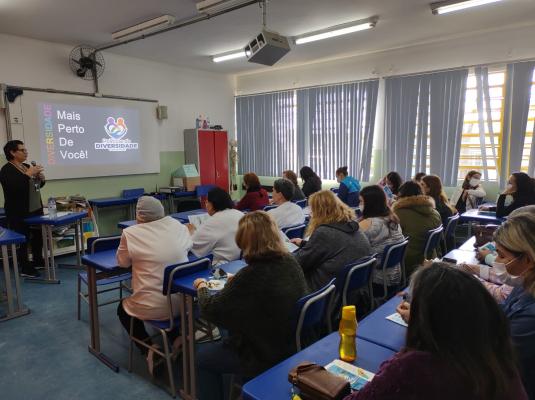 A Prefeitura de Guarulhos, por meio da Subsecretaria de Políticas da Diversidade, promoveu nesta terça-feira (7) uma palestra sobre diversidade para um público de 30 professores da EPG Dalva Mariana Ronchi Mingossi, na Vila Barros. A ação faz parte do projeto Diversidade Mais Perto de Você, que leva orientações, conhecimento e informações sobre o assunto a escolas, empresas e instituições, além de disponibilizar os serviços oferecidos pela subsecretaria.
