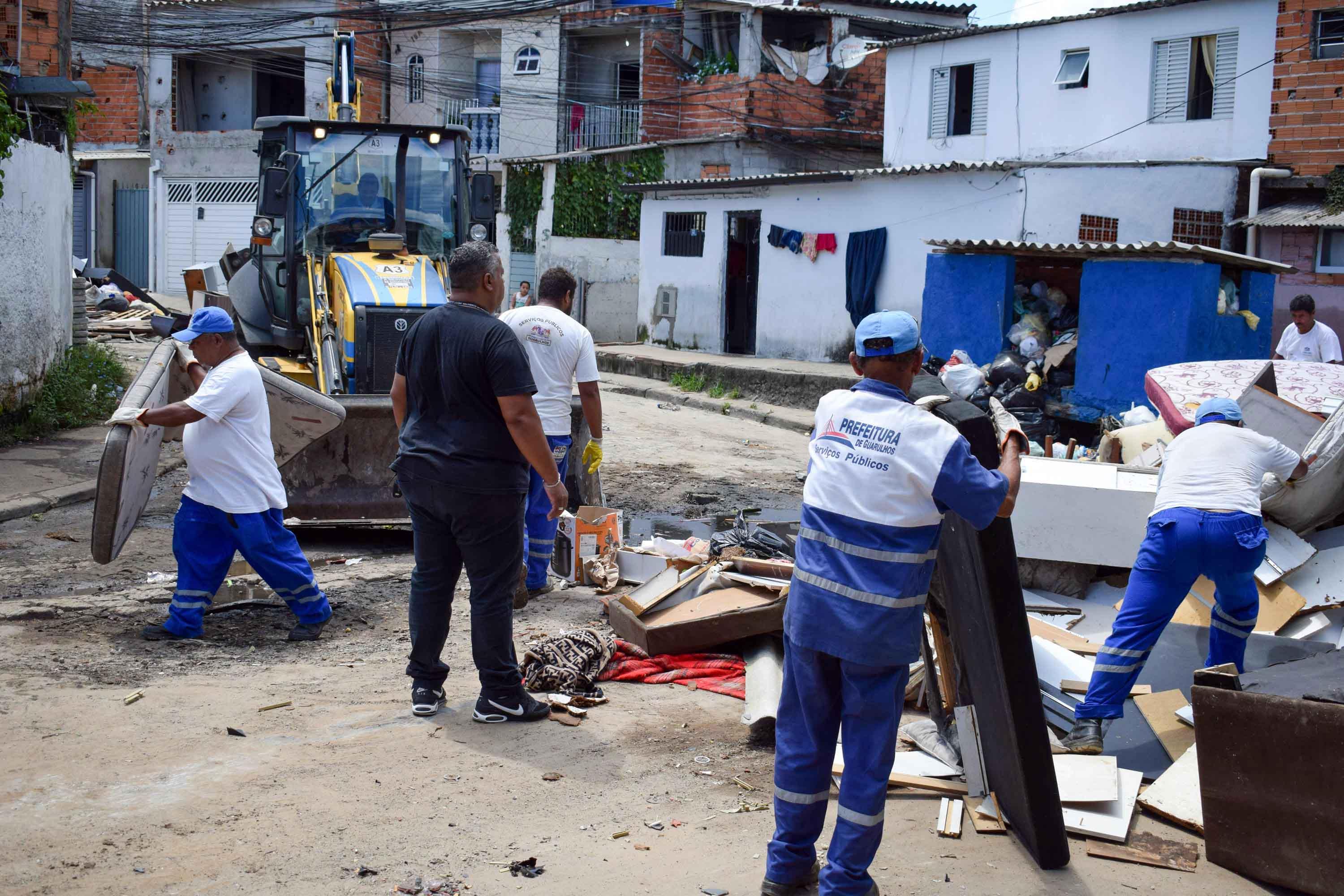 A rua João de Souza, no Jardim Bela Vista, impactada pelos alagamentos causados pelo forte temporal que atingiu Guarulhos na segunda-feira (10), recebeu uma equipe da Secretaria de Serviços Públicos para efetuar a limpeza da via nesta quarta-feira (12).