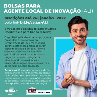 A Prefeitura de Guarulhos, em parceria com o Serviço Brasileiro de Apoio às Micro e Pequenas Empresas (Sebrae), receberá até 24 de janeiro as inscrições para bolsistas de agente local de inovação. São oito vagas, cinco para atuação imediata e três para banco reserva, e os interessados devem acessar o link https://bit.ly/vagas-ALI.