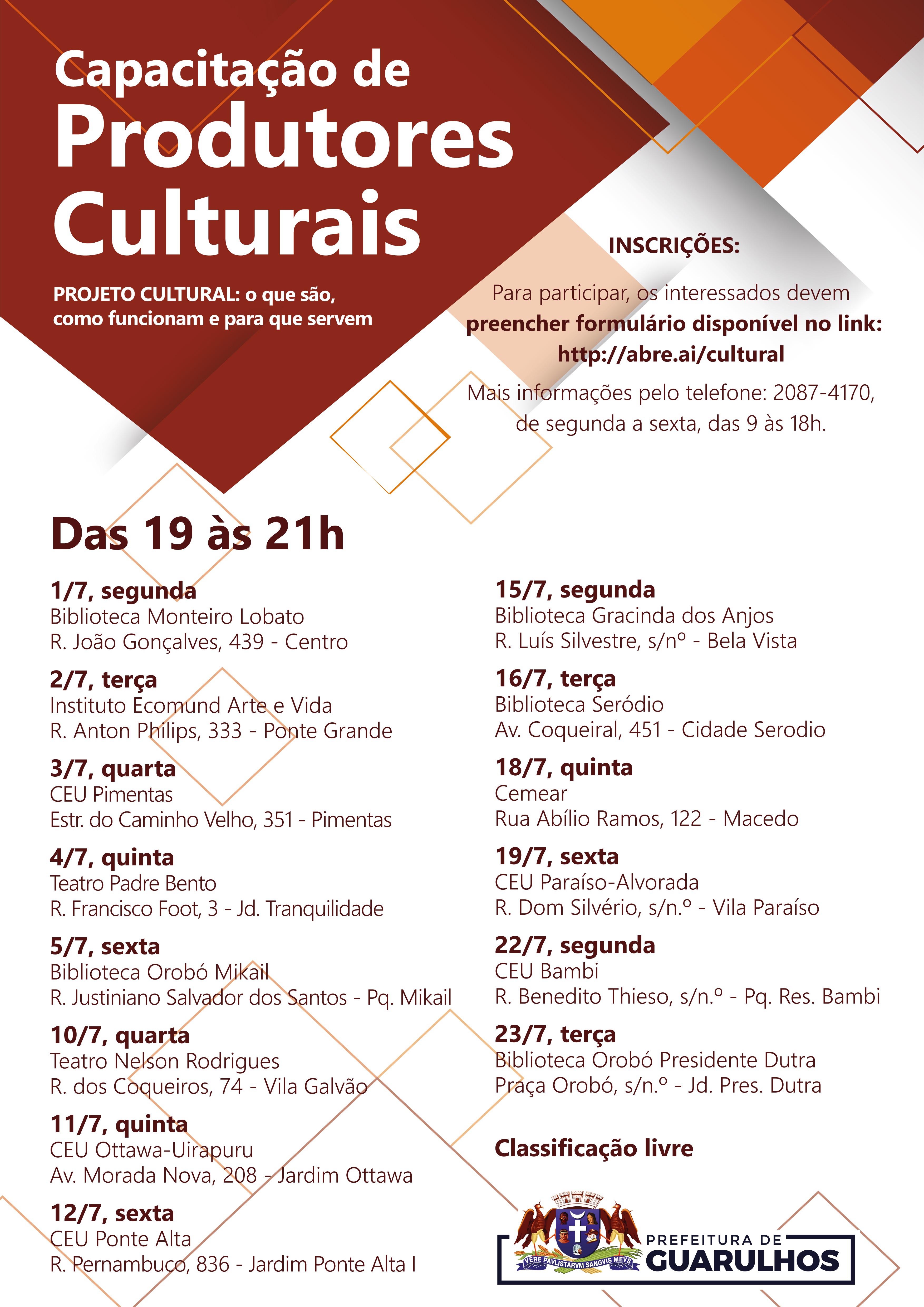 A Secretaria de Cultura irá promover em julho encontros gratuitos para capacitação de interessados em desenvolver projetos culturais. O primeiro acontecerá em 1º de julho na Biblioteca Monteiro Lobato, no Centro.