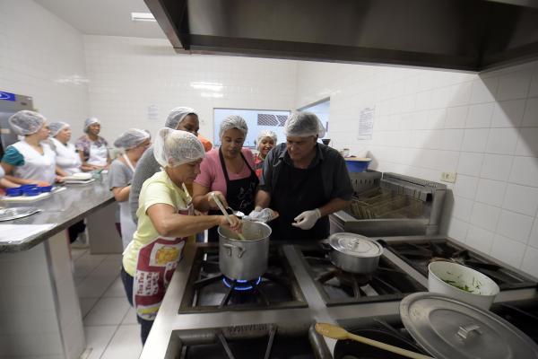 Na aula desta terça-feira, dia 9, a turma de 23 alunos elaborou acompanhamentos como risoto de abobrinha, tabule de quinoa, cuscuz marroquino com legumes salteados e salada de feijão jalo com rúcula e tomate seco. A iniciativa é da Secretaria de Desenvolvimento Social e visa capacitar pessoas de baixa renda para a inserção delas no mercado de trabalho, além de ser uma alternativa para geração de renda familiar.