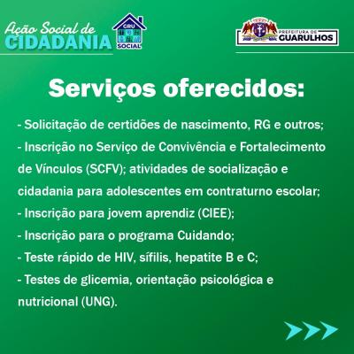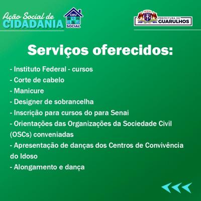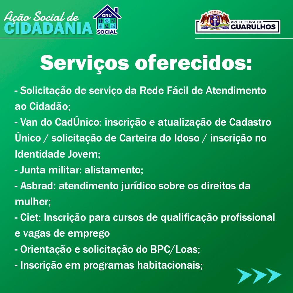 A segunda edição do GRU Social, ação de cidadania promovida pela Prefeitura de Guarulhos, acontecerá neste sábado (7), das 9h às 15h, no Cras Centro (rua Santana do Jacaré, 84, Jardim Bom Clima). O evento, organizado pela Secretaria de Desenvolvimento e Assistência Social (SDAS), disponibilizará diversos serviços gratuitos, tanto municipais quanto de parceiros.