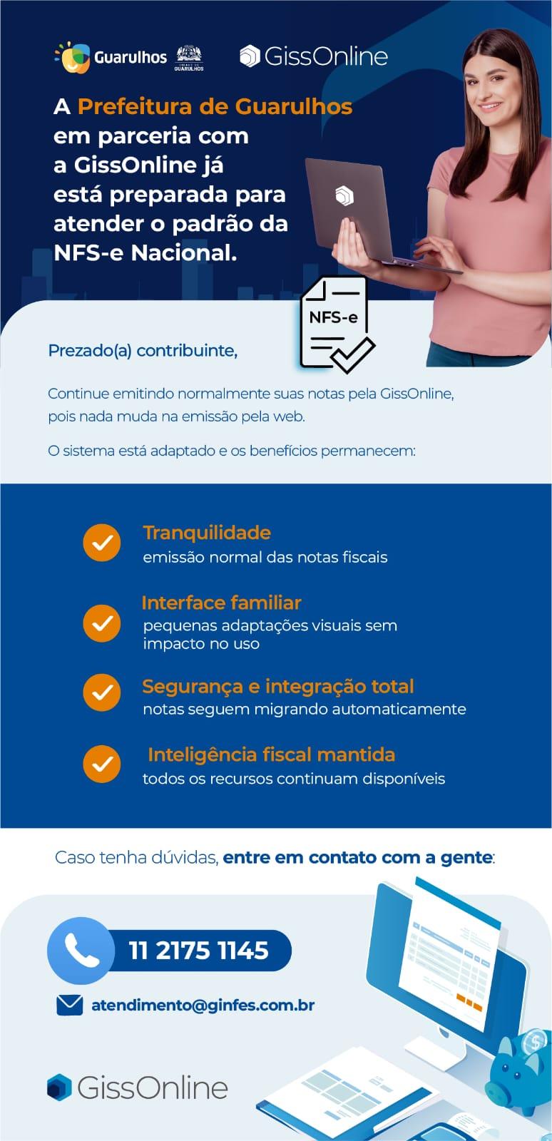 Por sua vez, a Secretaria de Finanças informa que o município de Guarulhos continuará utilizando o seu sistema emissor próprio, o GINFES, para a geração das notas fiscais de serviço.