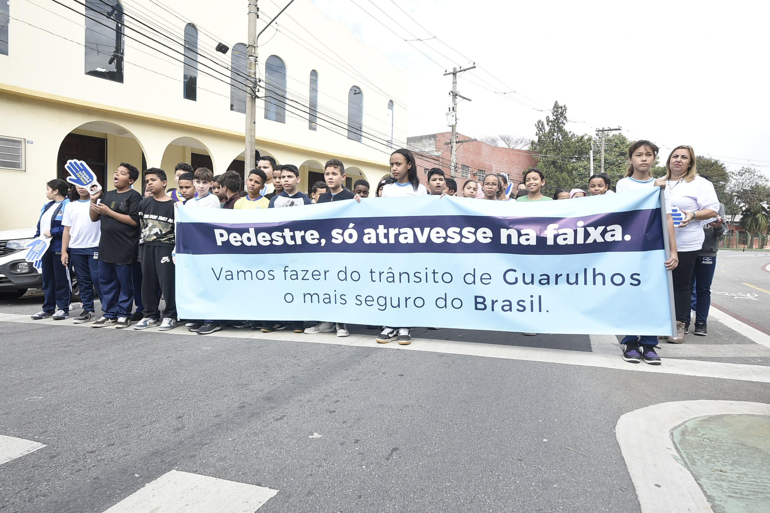 Os estudantes caminharam carregando uma faixa com a frase “Pedestre, só atravessa na faixa. Vamos fazer do trânsito de Guarulhos o mais seguro do Brasil”, além de uma mão de papel com o alerta: "Atenção! Respeite a faixa".