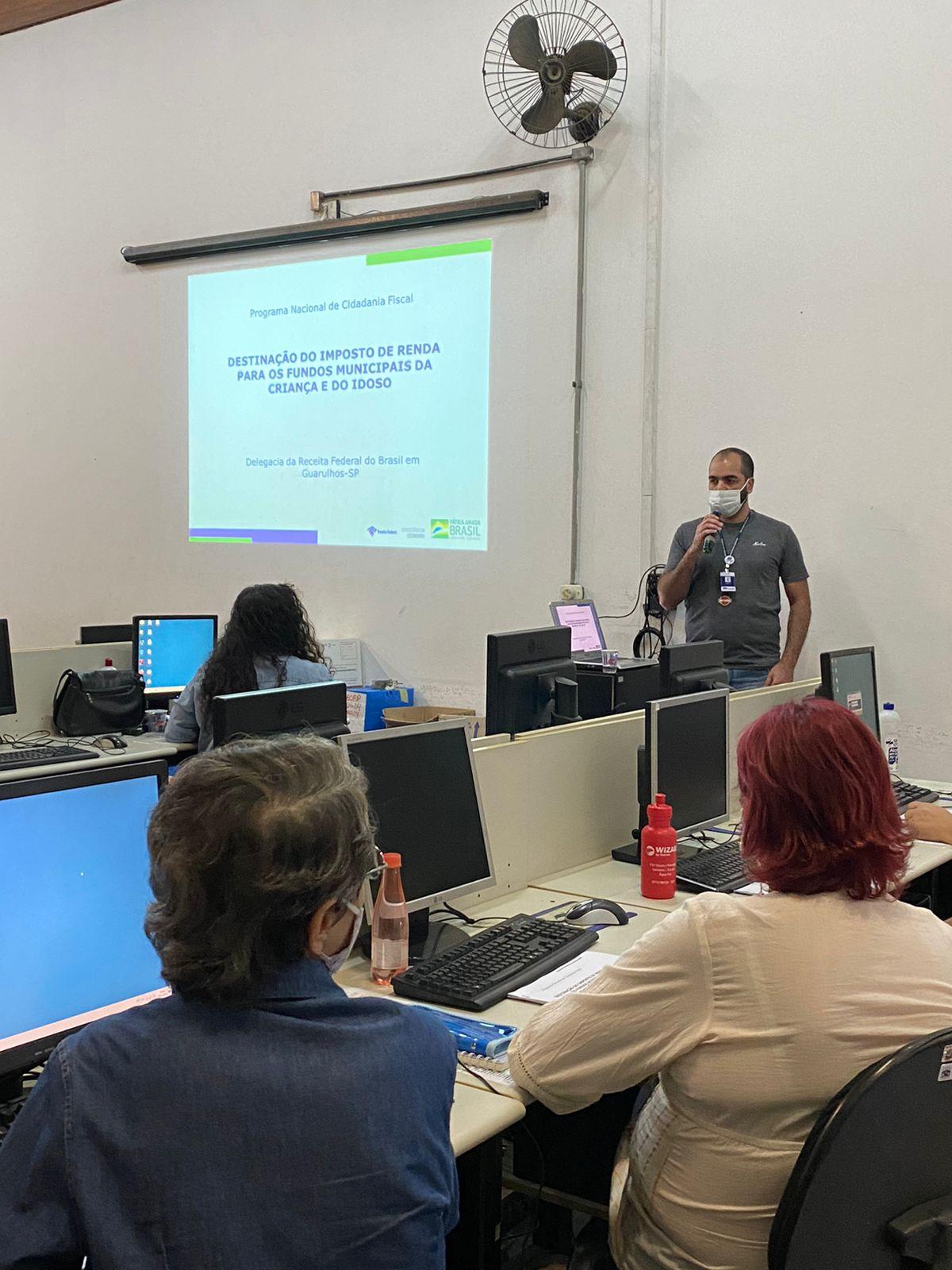 Cerca de 40 pessoas, entre membros do Conselho Municipal dos Direitos da Criança e do Adolescente (CMDCA), do Conselho Municipal dos Direitos da Pessoa Idosa (CMDPI), da sociedade civil e funcionários públicos participaram nesta terça-feira (23) de uma capacitação sobre destinação de percentual do Imposto de Renda (IR) para o Fundo Municipal da Criança e do Adolescente (Fumcad) e o Fundo Municipal da Pessoa Idosa (FMPI) no Adamastor Centro. A ação da Prefeitura de Guarulhos, em parceria com o CMDCA e CMDPI, contou com a participação do técnico da Receita Federal Marcos Borges e de Alex Cardoso, secretário-adjunto de Desenvolvimento e Assistência Social.