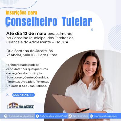 Estão abertas até o dia 12 de maio as inscrições para novos conselheiros tutelares em Guarulhos. São 35 vagas divididas entre as regiões Bonsucesso, Centro, Cumbica, Pimentas Unidade I, Pimentas Unidade II, São João e Taboão e os interessados, desde que preencham todos os requisitos, devem procurar a sede do Conselho Municipal dos Direitos da Criança e do Adolescente (CMDCA), na rua Santana do Jacaré, 84, 2º andar, sala 16, Jardim Bom Clima, para efetuar a inscrição.