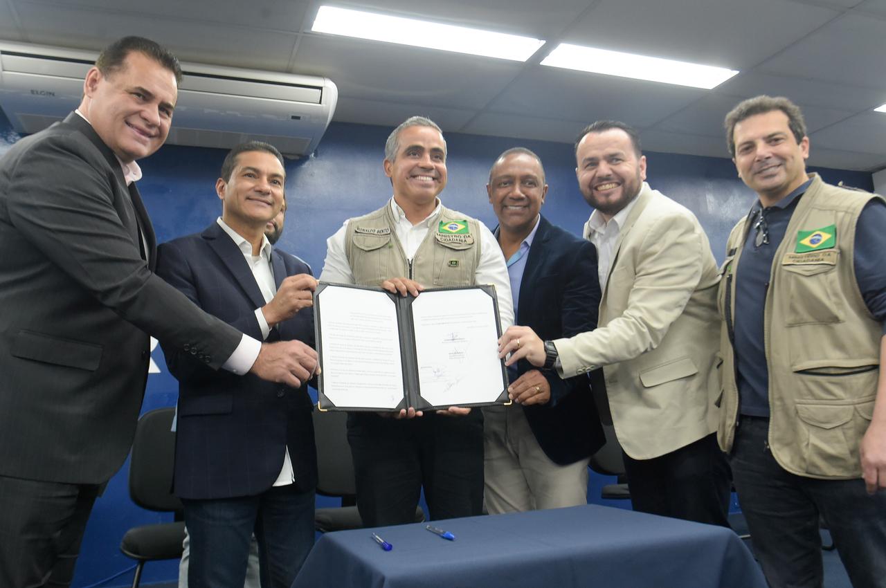 A Prefeitura de Guarulhos recebeu nesta segunda-feira (27), do Ministério da Cidadania, um veículo de carga do programa federal Alimenta Brasil, que será utilizado pelo Banco Municipal de Alimentos. A entrega aconteceu em cerimônia realizada no auditório do Paço Municipal com a presença do prefeito em exercício, Professor Jesus, do secretário de Desenvolvimento e Assistência Social (SDAS) de Guarulhos, Fábio Cavalcante, e do ministro da Cidadania, Ronaldo Bento.