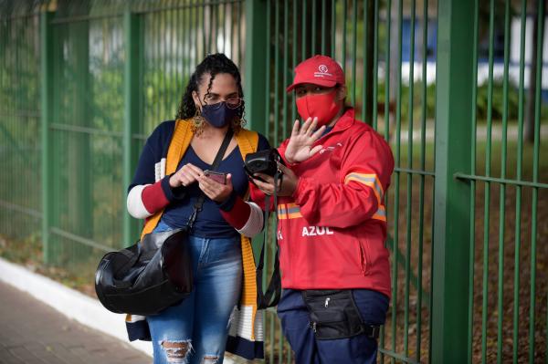 As monitoras Leila Fernandes e Larissa Stefany tiraram todas as dúvidas dos usuários na manhã desta terça-feira (6) na avenida Bom Clima, no bairro homônimo. Com calma, explicavam como funcionaria o serviço e todas as facilidades que os motoristas teriam para reservar as suas vagas. "Começamos às 8h e vamos até as 17h. Será como um dia normal de trabalho, mas sem a cobrança. Vamos apenas seguir as orientações para deixar o funcionamento o mais claro possível para as pessoas", disse Larissa.