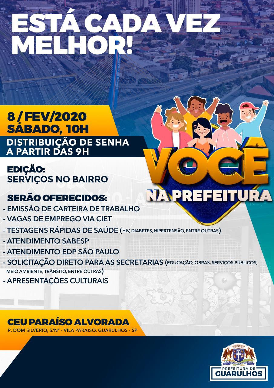O Centro de Educação Unificado (CEU) Paraíso-Alvorada recebe neste sábado (8), às 10h, a 17ª edição do Você na Prefeitura com a disponibilização de diversos serviços. Trata-se de um programa que fomenta a comunicação dos moradores da cidade com o órgão público, mediante solicitações e sugestões de melhorias. Os munícipes serão recepcionados pelo prefeito Guti e representantes de todas as secretarias municipais. As senhas serão distribuídas a partir das 9h.