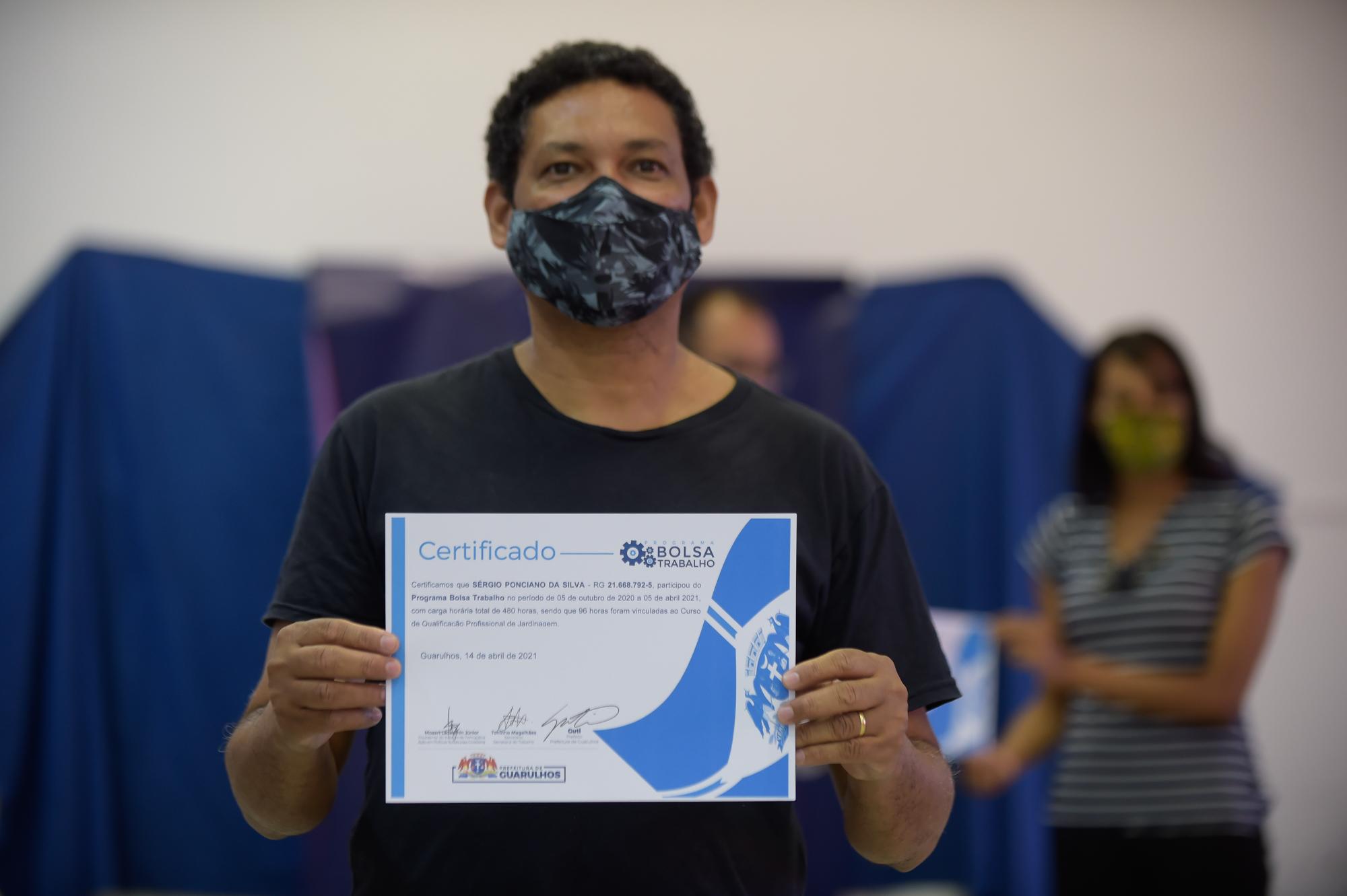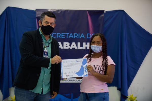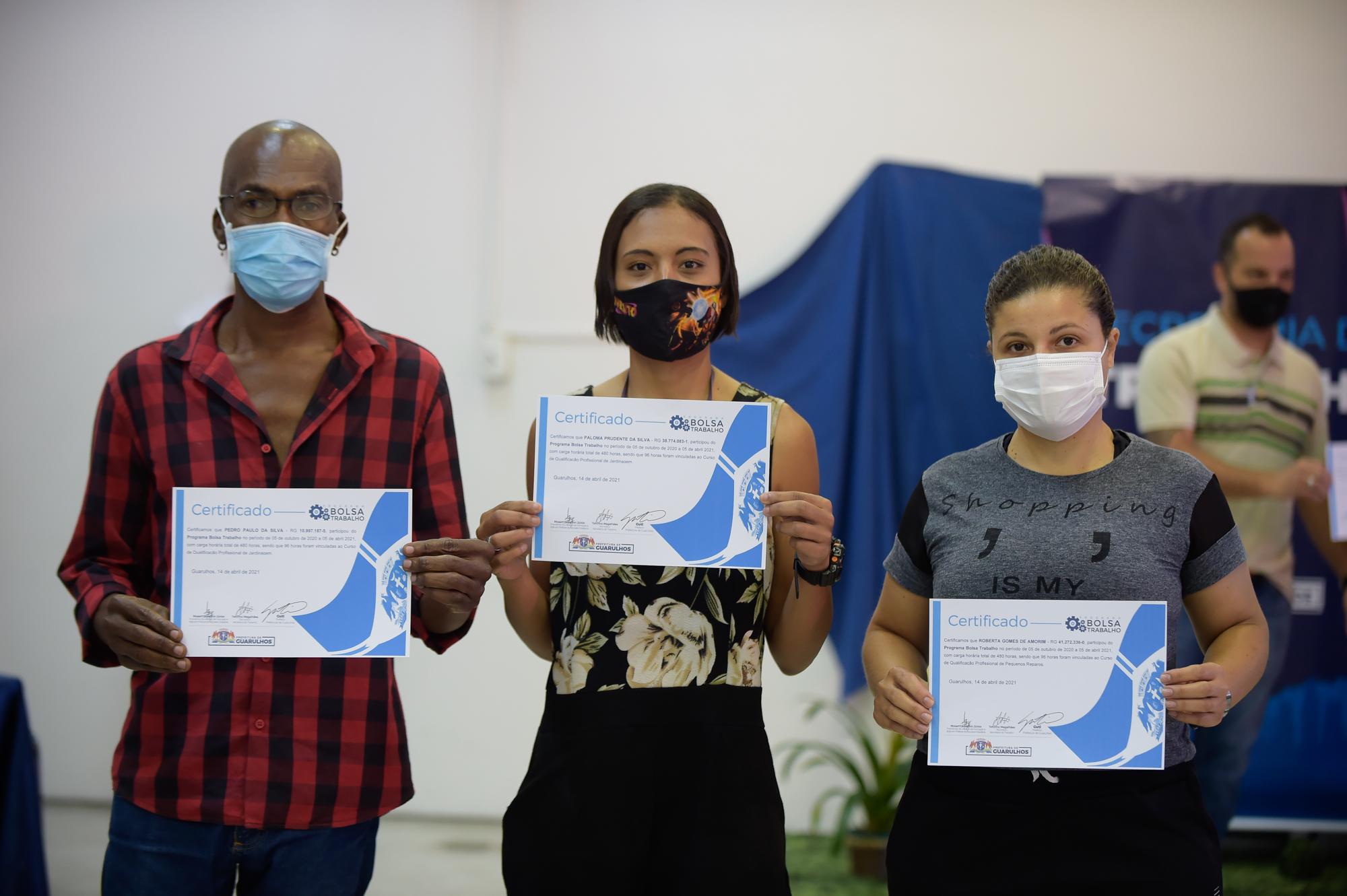 A Secretaria do Trabalho de Guarulhos entregou nesta quarta-feira (5) 72 certificados de conclusão de curso para os alunos do programa Bolsa Trabalho. A cerimônia, que foi dividida em dois horários para respeitar os protocolos de distanciamento social, aconteceu no Adamastor Centro com a presença do titular da Pasta, Toninho Magalhães, do representante da Secretaria de Serviços Públicos (SSP), Alexandre Garrido, e de Ricardo Bovolenta, professor de um dos cursos.