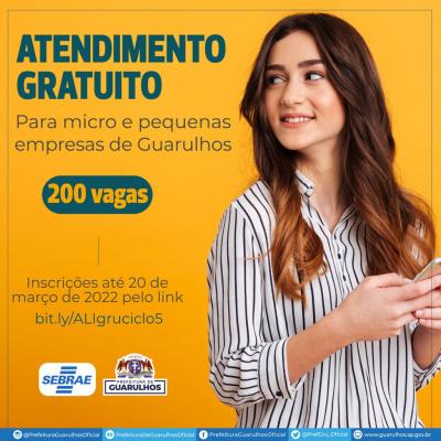 A Prefeitura de Guarulhos, em parceria com o Serviço Brasileiro de Apoio às Micro e Pequenas Empresas (Sebrae) e por meio do programa Brasil Mais Agentes de Inovação, receberá até o dia 20 de março as inscrições para o atendimento gratuito para micro e pequenas empresas da cidade. É necessário acessar o link https://bit.ly/ALIgruciclo5 para efetivar a inscrição.