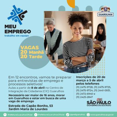 As aulas terão início na próxima segunda-feira (8) no CIC Guarulhos, instalado na estrada do Capão Bonito, 53, no Jardim Maria de Lourdes. Para participar é necessário ser maior de 16 anos e morar na cidade, além de estar desempregado.