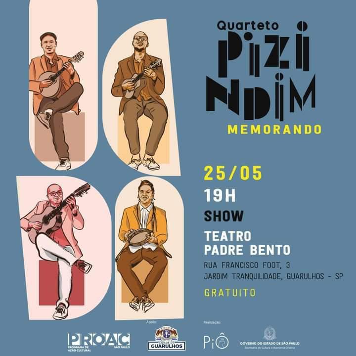 Emerson Bernardes (cavaquinho), Claudinho Martins (pandeiro), Rodrigo Carneiro (violão de 7 cordas) e Rafael Esteves (bandolim), integrantes do Quarteto Pizindim, apresentam o show Memorando nesta quinta-feira (25), às 19h, no Teatro Padre Bento. A apresentação é gratuita e a classificação, livre.