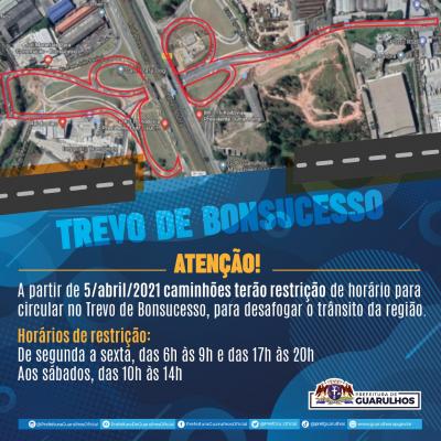 Na próxima segunda-feira (5) a Prefeitura de Guarulhos implementará a restrição de horário de tráfego de caminhões pesados no Trevo de Bonsucesso com o objetivo de melhorar o trânsito da região. Nessa primeira fase de operação, os agentes da Secretaria de Transportes e Mobilidade Urbana (STMU) e da Guarda Civil Municipal (GCM) irão orientar sobre as novas medidas para os motoristas, mas não aplicarão multas.