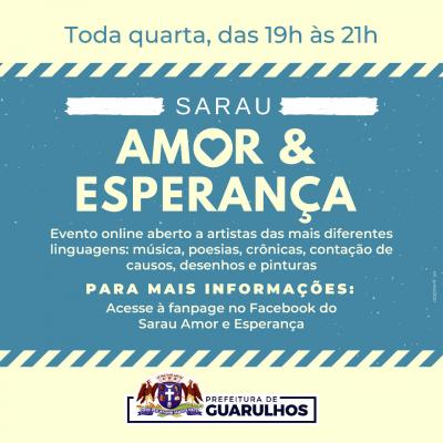 Toda quarta-feira, sempre das 19h às 21h, a Prefeitura de Guarulhos apresenta o Sarau Amor e Esperança, veiculado pela fanpage do evento no Facebook, disponível em https://bit.ly/amoreesperança. Iniciativa da Secretaria de Cultura e da Casa de Cultura Popular São Rafael, o sarau tem como objetivo proporcionar cultura aos participantes e desenvolvimento para artistas iniciantes. A participação é livre.