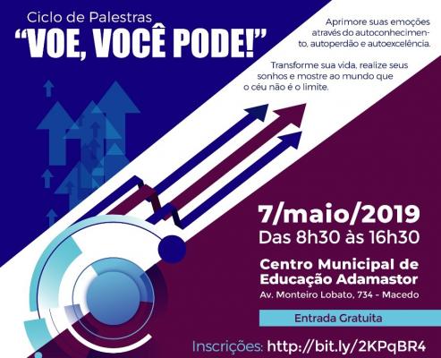 O Adamastor Centro recebe no próximo dia 7 de maio, a segunda edição do ciclo de palestras “Voe, você pode!”. O evento, idealizado pela Secretaria do Trabalho, em parceria com o Instituto Ser Diferencial, acontece das 8h30 às 16h30 e conta com 12 palestrantes que irão discutir temas como mercado de trabalho, propósito, motivação e futuro. As inscrições devem ser feitas pelo seguinte link: http://bit.ly/2KPqBR4