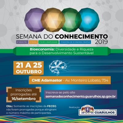 O prazo para a inscrição de projetos na Semana do Conhecimento 2019 foi prorrogado pela Prefeitura de Guarulhos até o dia 16 de setembro, exceto para Feira de Ciências e Engenharia de Guarulhos (Feceg), cujas inscrições de projetos superaram em mais de 35% a capacidade da infraestrutura destinada a essa atividade durante o evento.