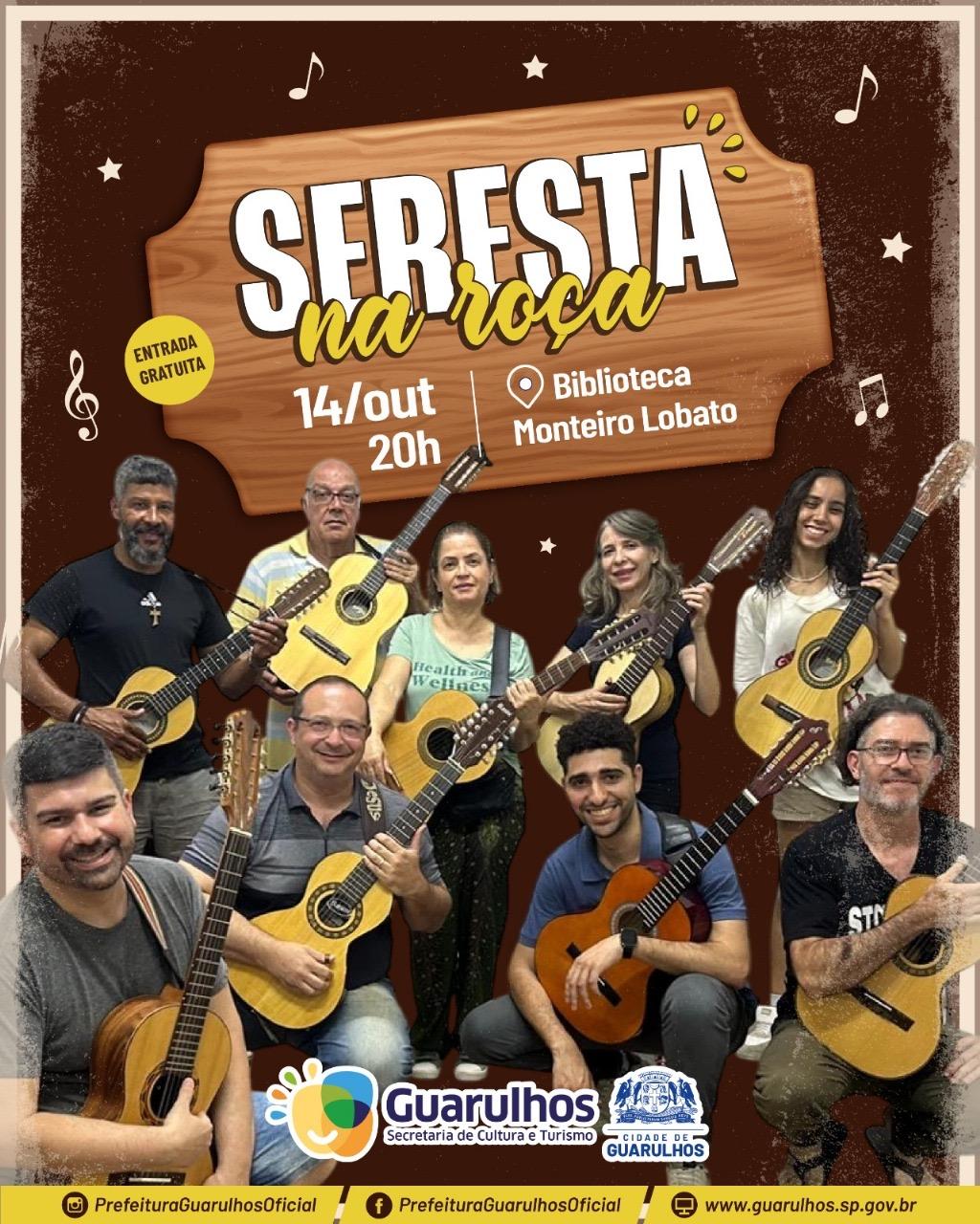 O show do grupo Seresta na Roça se apresenta gratuitamente no auditório da Biblioteca Monteiro Lobato no próximo dia 14 de outubro, às 20h. Coordenado pelo professor Zé Helder, o grupo é formado por 13 alunos de viola caipira do Conservatório Municipal de Artes de Guarulhos.